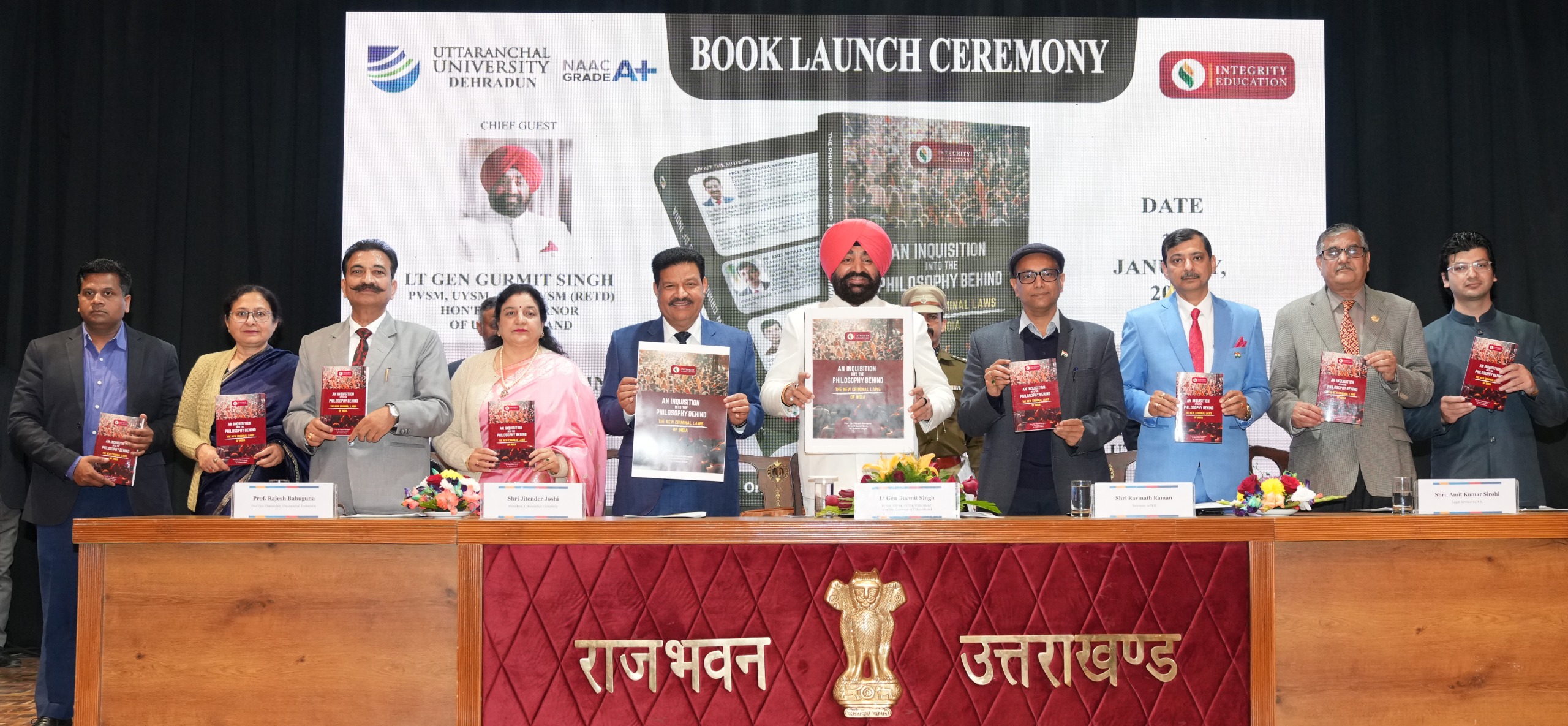 देहरादून : राज्यपाल लेफ्टिनेंट जनरल गुरमीत सिंह (से नि) ने शुक्रवार को राजभवन में उत्तरांचल विश्वविद्यालय द्वारा आयोजित कार्यक्रम में ‘‘एन इनक्विजिशन इनटू द फिलॉसफी बिहाइंड द न्यू क्रिमिनल लॉज ऑफ इंडिया’’ (An Inquisition Into The Philosophy Behind The New Criminal Laws of India) पुस्तक का विमोचन किया। यह पुस्तक भारत के तीन नए आपराधिक कानूनों पर आधारित है। यह पुस्तक उत्तरांचल विश्वविद्यालय के प्रतिकुलपति प्रो0 राजेश बहुगुणा, विधि परामर्शी श्री राज्यपाल अमित कुमार सिरोही व डॉ0 वैभव उनियाल द्वारा संयुक्त रूप से लिखी गई है।